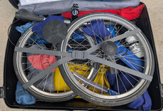 Part of a matched pair of beautiful Cream Blue Bike Friday New World Tourist bikes. This package is loaded! With this purchase you have EVERYTHING YOU NEED for an amazing tour adventure. Buy both bikes and have a blast together.